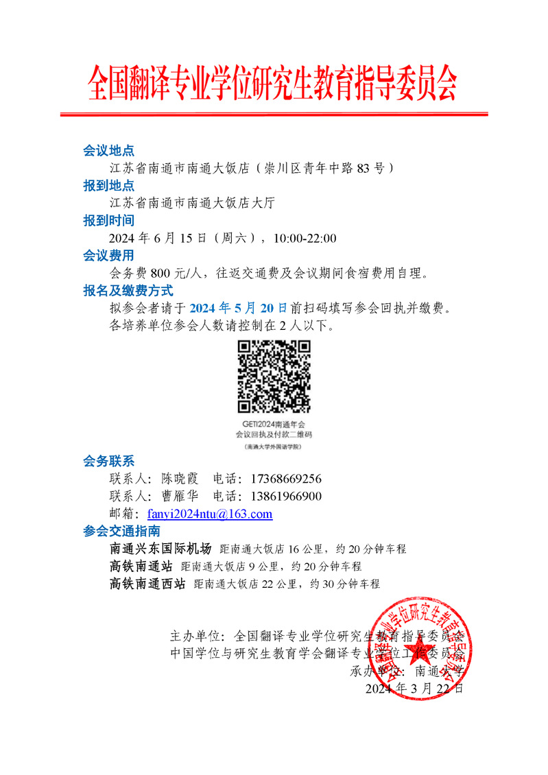 二号通知|全国翻译教指委2024年工作会议暨全国翻译专业学位研究生教育2024年年会