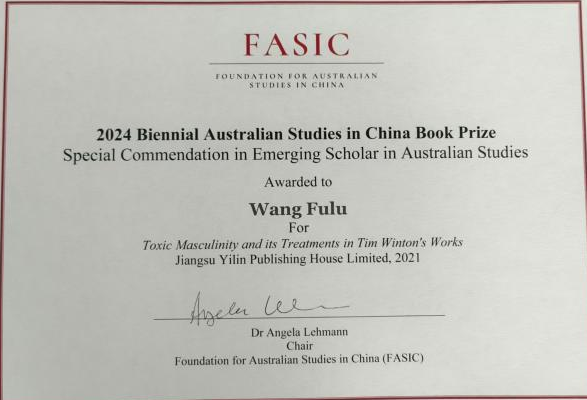 本届双年会还颁发了“2024年在华澳大利亚研究基金会双年展图书奖”。本届FASIC图书奖特别增设一个“学术新秀”奖,鼓励初露锋芒的新晋学者。本中心王福禄老师凭借论文《蒂姆温顿小说中“有毒的男性气质”与治疗》成为首位获此殊荣的青年学者,展现了本中心老师的科研实力。