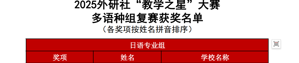 本次多语种组大赛涵盖日语、俄语、德语、法语、朝鲜语 / 韩语五个语种。自 2025 年 2 月启动,初赛阶段通过院校选拔与推荐,吸引了全国 200 余所高校的 500 余名多语种教师报名参赛。经评审专家组严格评审,最终评选出各语种复赛一、二、三等奖。